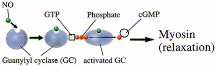 NO induces synthesis of cGMP by stimulation of GC leading to relaxation of myosin (muscle protein)
