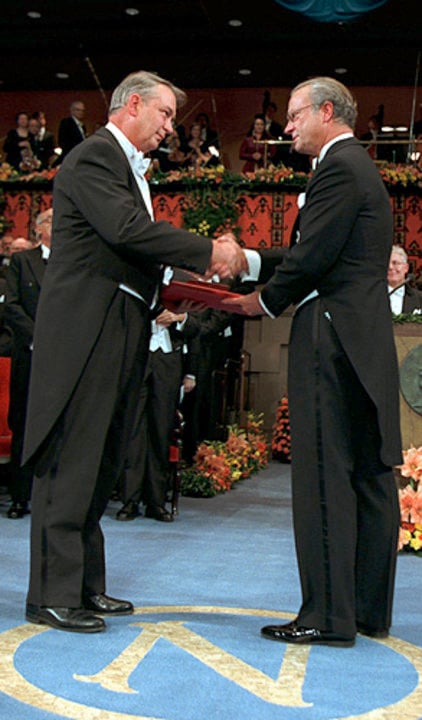 1 (of 2) Ferid Murad receiving his Nobel Prize from the hands of His Majesty the King.