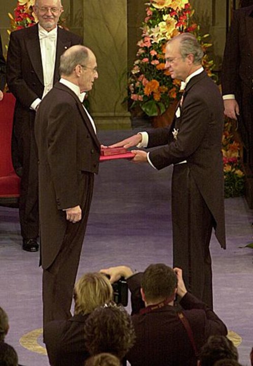 Physiology or Medicine Nobel Laureates Paul Greengard (right) and Arvid Carlsson (left) seated beside Sweden's Princess Madeleine at the Nobel Banquet, Stockholm City Hall, 2000.