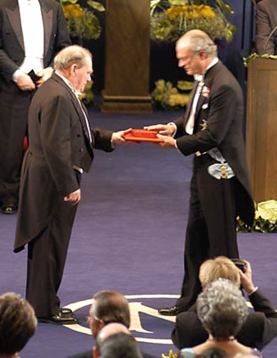 The 2002 Nobel Laureates assembled for a group photo. Back row from left: John E. Sulston, Daniel Kahneman, Kurt Wüthrich, Raymond Davis Jr., Masatoshi Koshiba, H. Robert Horvitz and Imre Kertész. Front row from left: Sydney Brenner, Koichi Tanaka, Jimmy Carter, Riccardo Giacconi and Vernon L. Smith. John B. Fenn is missing in photo.