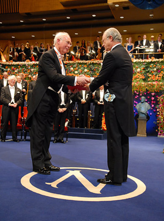 Sir Martin J. Evans receiving his Nobel Prize from His Majesty King Carl XVI Gustaf of Sweden at the Stockholm Concert Hall, 10 December 2007.