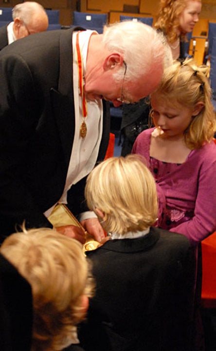 Sir Martin J. Evans showing his Nobel Prize medal and diploma to his grandchildren at the Stockholm Concert Hall, 10 December 2007.
