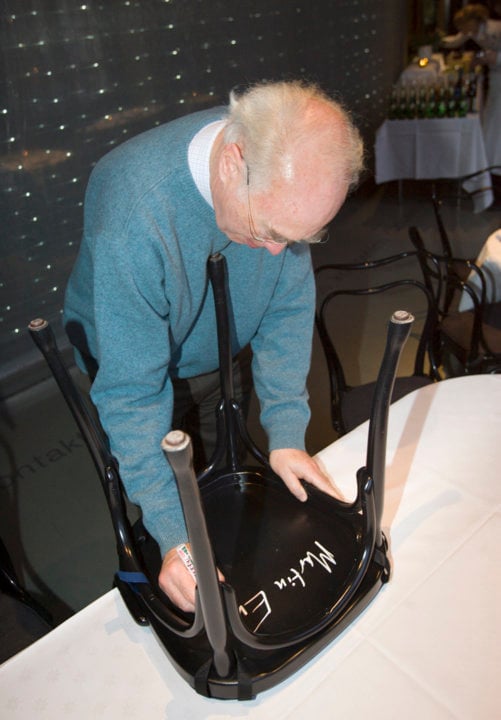 Sir Martin J. Evans, like many Nobel Laureates before him, autographs a chair at Kafé Satir at the Nobel Museum in Stockholm, 6 December 2007.
