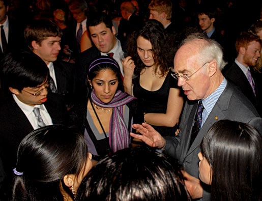 Sir Martin J. Evans (right) meeting students during the Nobel Foundation reception at the Nordic Museum in Stockholm, 9 December 2007.
