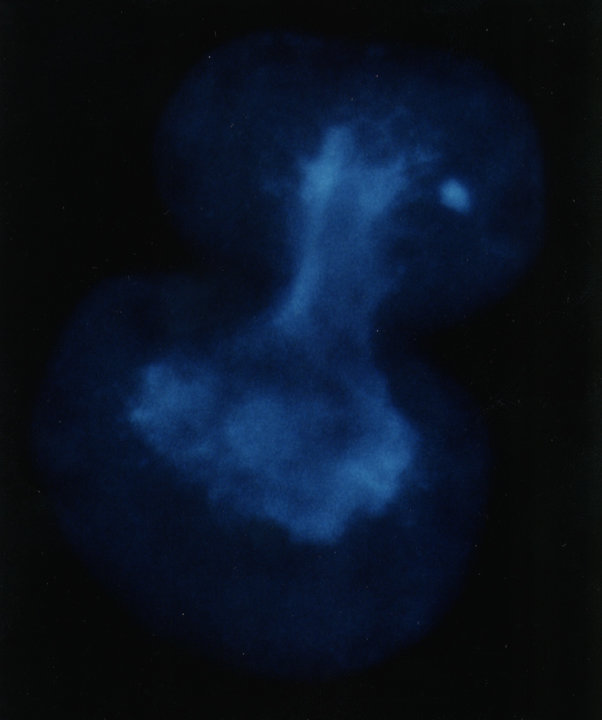 26 (of 31) This image dramatizes a pond microorganism cell with damaged telomeres trying, unsuccessfully, to divide. Telomeres are the last portion of chromosomes to divide. The lit up, elongated filaments shown in the cell are chromosomes that the cell is trying to pull apart. They cannot be separated because they are stuck together.