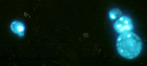 25 (of 31) Damaged telomeres have prevented this yeast cell from dividing. Instead, it has continuously replicated its DNA in preparation for division, resulting in numerous copies of DNA, as seen in the multiple bright spots of stained DNA. (Normal cells would display a single bright spot if their DNA were stained.)