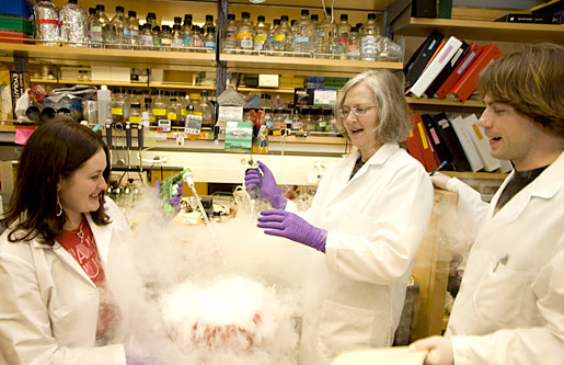 28 (of 31) Professor Elizabeth Blackburn (middle) in her lab with Beth Cimini (left) and Mike Pollard (right).