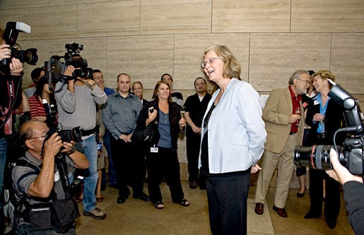 21 (of 31) Elizabeth Blackburn greets colleagues and the media at a reception held in Genentech Hall at UCSF Mission Bay to celebrate her award of the Nobel Prize in Physiology or Medicine.