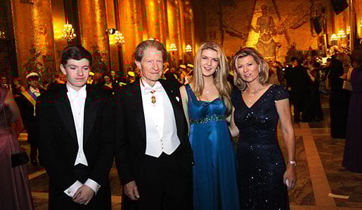 Sir John B. Gurdon with relatives in the Golden Hall. From left: Oliver Connolly, Sir John B. Gurdon, Serena Connolly and Aurea Connolly.