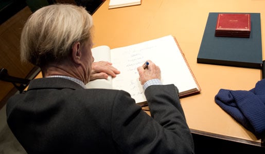 Sir John B. Gurdon visits the Nobel Foundation on 12 December 2012 and signs the guest book. On this occasion, the Laureates retrieve the Nobel diploma and Medal, which have been displayed in the Golden Hall of the City Hall following the Nobel Prize Award Ceremony. The Laureates also discuss the details concerning the transfer of their prize money.