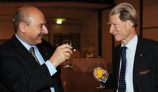 Sir John B. Gurdon (right) is greeted by Bruce A. Beutler, 2011 Nobel Laureate in Physiology or Medicine (left), at a reception at Karolinska Institutet, 7 December 2012.