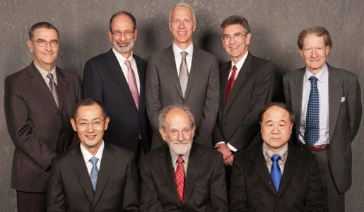 The 2012 Nobel Laureates assembled for a group photo during their visit to the Nobel Museum in Stockholm, 6 December 2012. Back row, left to right: Nobel Laureate in Physics Serge Haroche, Laureate in Economic Sciences Alvin E. Roth, Nobel Laureates in Chemistry Brian K. Kobilka and Robert J. Lefkowitz, and Nobel Laureate in Physiology or Medicine Sir John B. Gurdon. Front row, left to right: Nobel Laureate in Physiology or Medicine Shinya Yamanaka, Laureate in Economic Sciences Lloyd S. Shapley and Nobel Laureate in Literature Mo Yan. Not in photo: Nobel Laureate in Physics David J. Wineland.