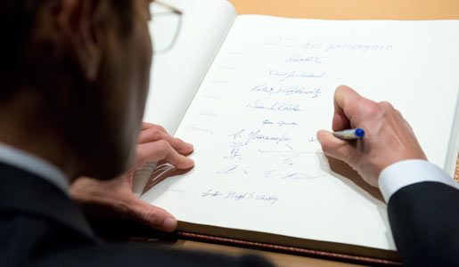 Shinya Yamanaka visits the Nobel Foundation on 12 December 2012 and signs the guest book. On this occasion, the Laureates retrieve the Nobel diploma and Medal, which have been displayed in the Golden Hall of the City Hall following the Nobel Prize Award Ceremony. The Laureates also discuss the details concerning the transfer of their prize money.