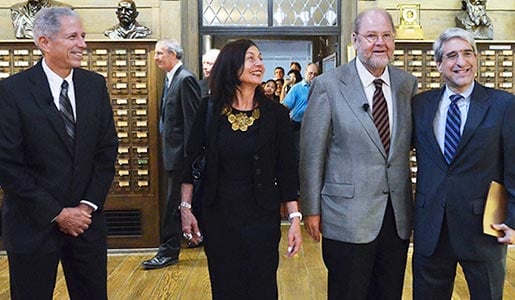 18 (of 19) James E. Rothman, third from left, at Yale University after the announcement of the 2013 Nobel Prize in Physiology or Medicine. From left: Robert Alpern, Dean of the Yale School of Medicine, Joy Hirsh, Professor of Psychiatry & Neurobiology, James Rothman and Peter Salovey, President of Yale University.