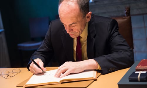 Thomas C. Südhof visits the Nobel Foundation on 11 December 2013 and signs the guest book. On this occasion, the Laureates retrieve the Nobel diploma and Medal, which have been displayed in the Golden Hall of the City Hall following the Nobel Prize Award Ceremony. The Laureates also discuss the details concerning the transfer of their prize money.