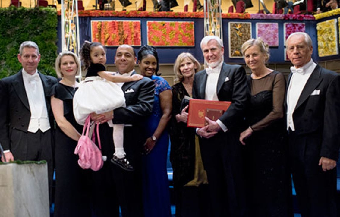 John O'Keefe with family and relatives on stage after the Nobel Prize Award Ceremony at the Stockholm Concert Hall, 10 December 2014.