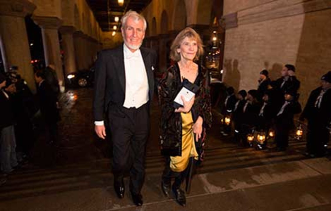 John O'Keefe with his wife, Mrs Eileen O'Keefe, on stage after the Nobel Prize Award Ceremony.