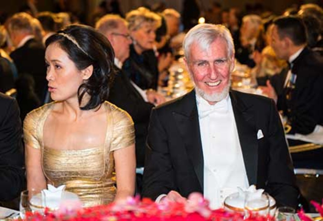 Dr Na Ji, spouse of Nobel Laureate Eric Betzig, and John O'Keefe at the table of honour at the Nobel Banquet.
