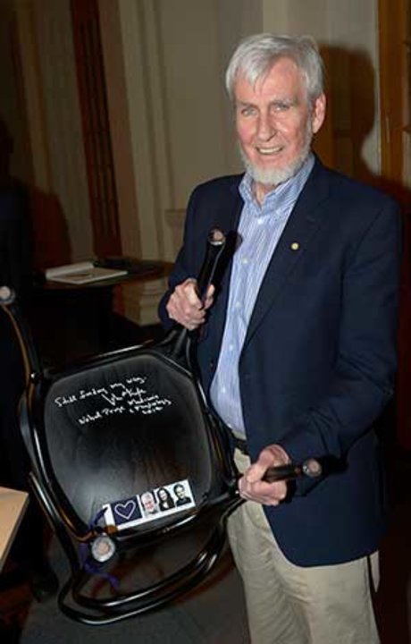 16 (of 19) Like many Nobel Laureates before him, John O'Keefe autographs a chair at Bistro Nobel at the Nobel Museum in Stockholm, 6 December 2014.