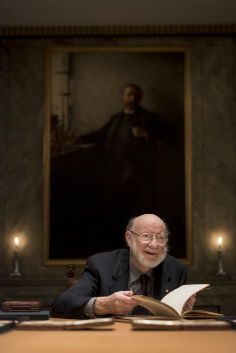 William C. Campbell explores the Nobel Foundation's guest book, signed by the Laureates since 1952, during his visit to the Nobel Foundation on 12 December 2015.