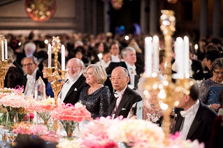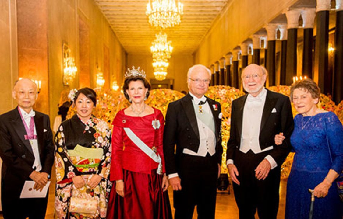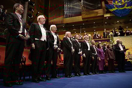 Nobel Laureates at the Nobel Prize Award Ceremony. From left: Physics Laureates Takaaki Kajita and Arthur B. McDonald, Chemistry Laureates Tomas Lindahl, Paul Modrich and Aziz Sancar, Medicine Laureates William C. Campbell, Satoshi Ōmura and Tu Youyou, Literature Laureate Svetlana Alexievich and Laureate in Economic Sciences Angus Deaton.