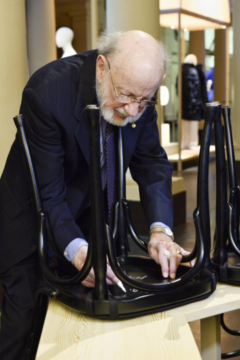 13 (of 15) Like many Nobel Laureates before him, William C. Campbell autographs a chair at Bistro Nobel at the Nobel Museum in Stockholm, 6 December 2015.