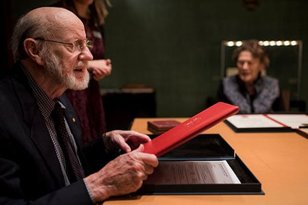 William C. Campbell takes a closer look at his Nobel diploma during his visit to the Nobel Foundation on 12 December 2015.
