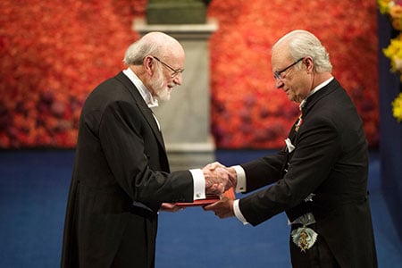 William C. Campbell receiving his Nobel Prize from H.M. King Carl XVI Gustaf of Sweden at the Stockholm Concert Hall, 10 December 2015.
