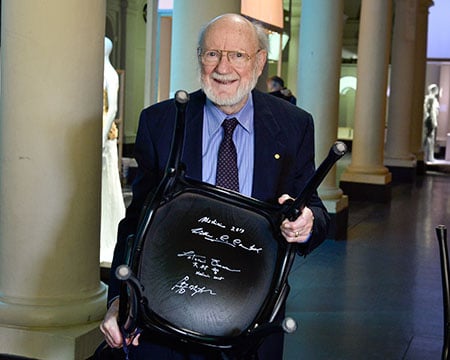 14 (of 15) Nobel Laureate William C. Campbell and the autographed chair at the Nobel Museum in Stockholm.