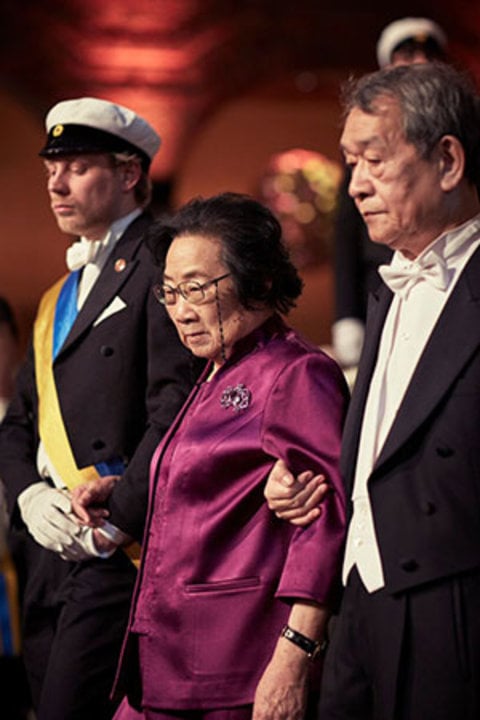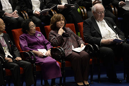 Nobel Laureates at the Nobel Prize Award Ceremony. From left: Physics Laureates Takaaki Kajita and Arthur B. McDonald, Chemistry Laureates Tomas Lindahl, Paul Modrich and Aziz Sancar, Medicine Laureates William C. Campbell, Satoshi Ōmura and Tu Youyou, Literature Laureate Svetlana Alexievich and Laureate in Economic Sciences Angus Deaton.