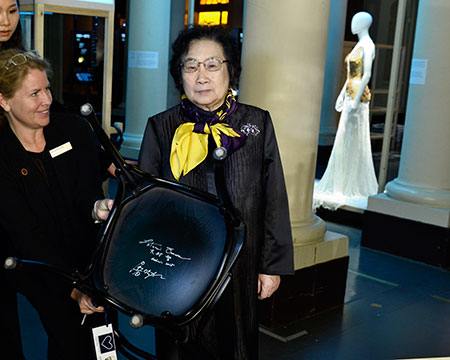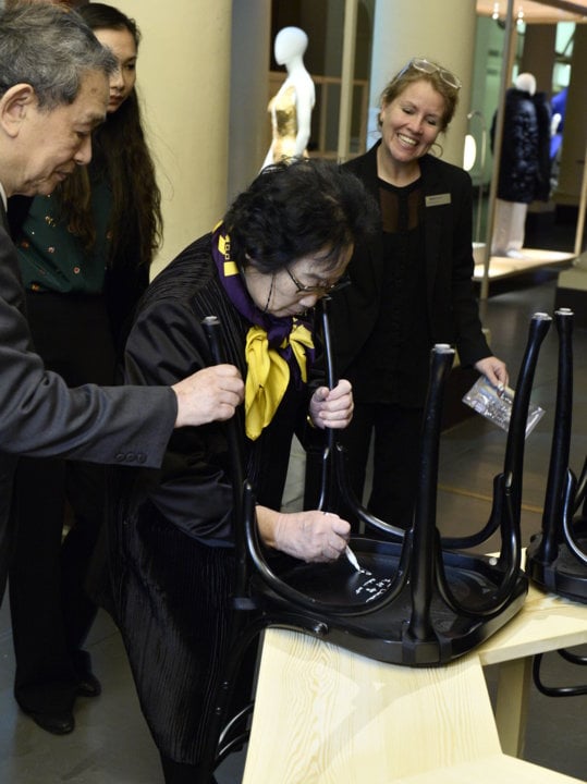 12 (of 14) Like many Nobel Laureates before her, Tu Youyou autographs a chair at Bistro Nobel at the Nobel Museum in Stockholm, 6 December 2015.