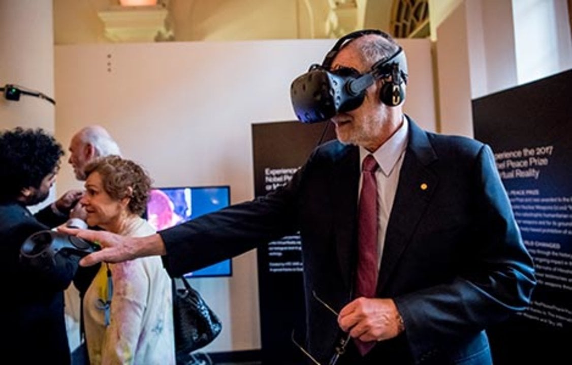 Michael Rosbash tries the VR installation 'The Day the World Changed', based on this year's Peace