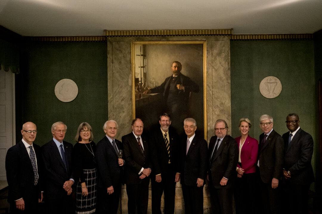 2018 laureates assembled at the Nobel Foundation on 12 December 2018. From left: physics laureate Arthur Ashkin's son Michael Ashkin, laureate in economic sciences William D. Nordhaus, physics laureates Donna Strickland and Gérard Mourou, chemistry laureates Sir Gregory P. Winter and George P. Smith, medicine laureates Tasuku Honjo and James P. Allison, chemistry laureate Frances H. Arnold, laureate in economic sciences Paul M. Romer and peace laureate Denis Mukwege.