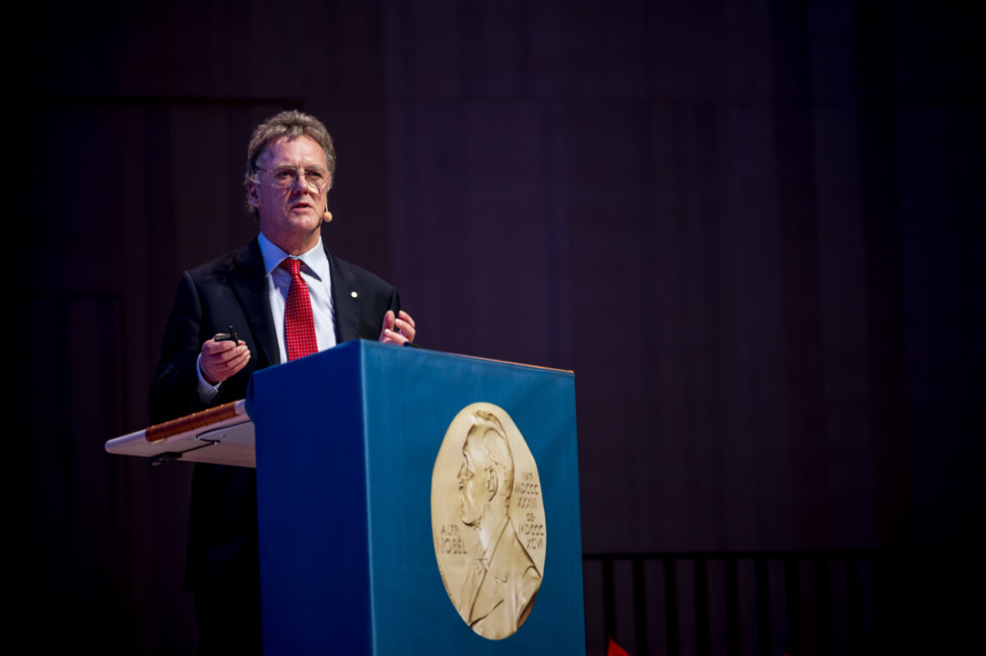 5 (of 9) Sir Peter J. Ratcliffe delivering his Nobel Lecture on 7 December 2019 at Aula Medica, Karolinska Institutet in Stockholm.