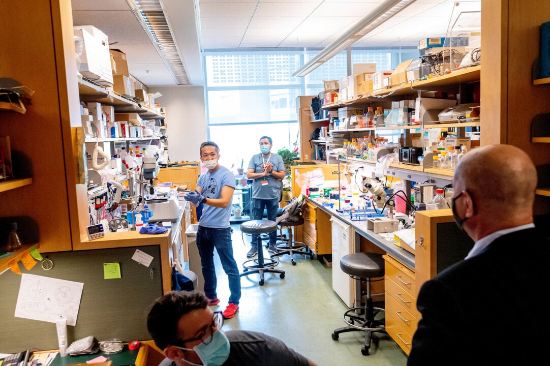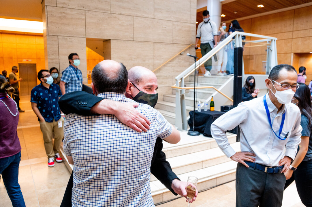 13 (of 14) David Julius hugs a colleague at UCSF’s Mission Bay campus while celebrating his Nobel Prize award on 4 October 2021. At right, Nobel Prize laureate Shinya Yamanaka, awarded the medicine prize in 2012.