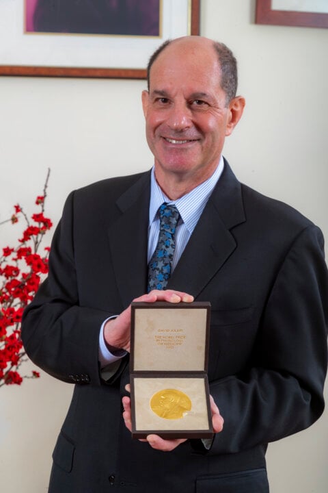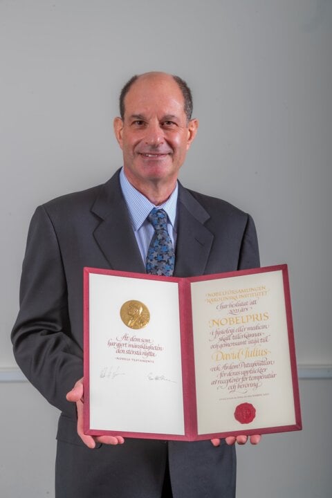 2 (of 14) David Julius showing his Nobel Prize diploma.