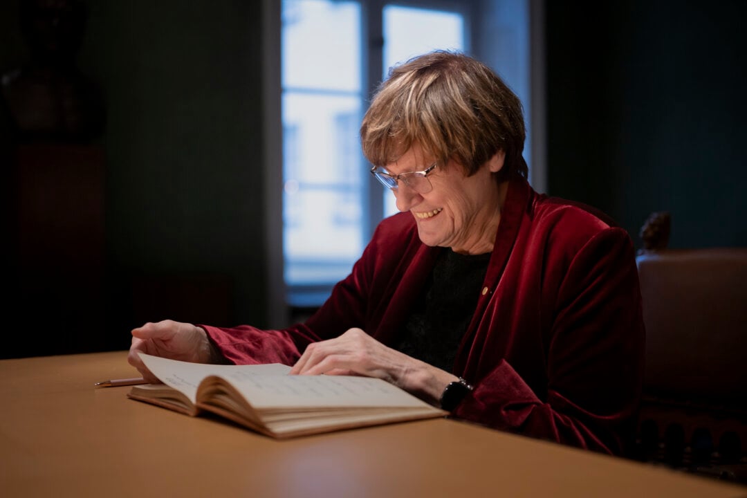 7 (of 18) Katalin Karikó having a look at the Nobel Foundation's guest book, signed by the laureates since 1952, during her visit to the Nobel Foundation on 11 December 2023.