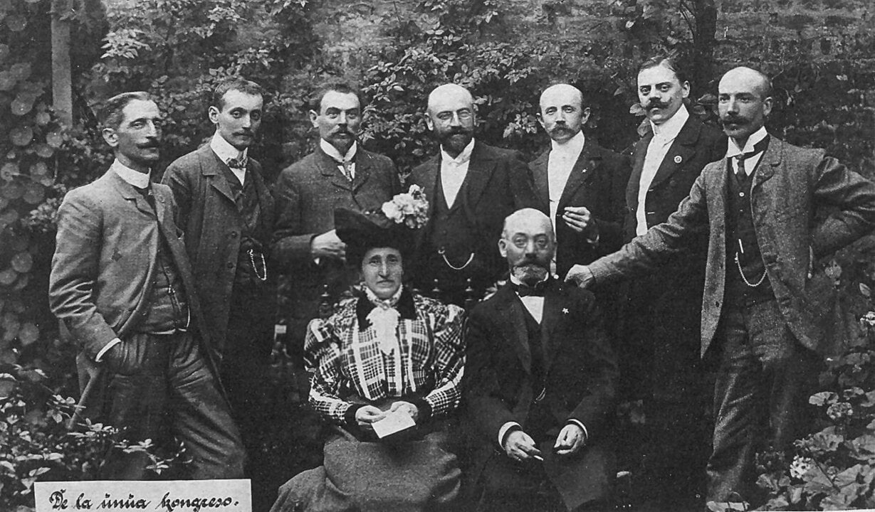 2 (of 2) Esperanto World Congress, Boulogne-sur-Mer 1905, group photo of some participants. Alfred Hermann Fried is third from left in the back row.