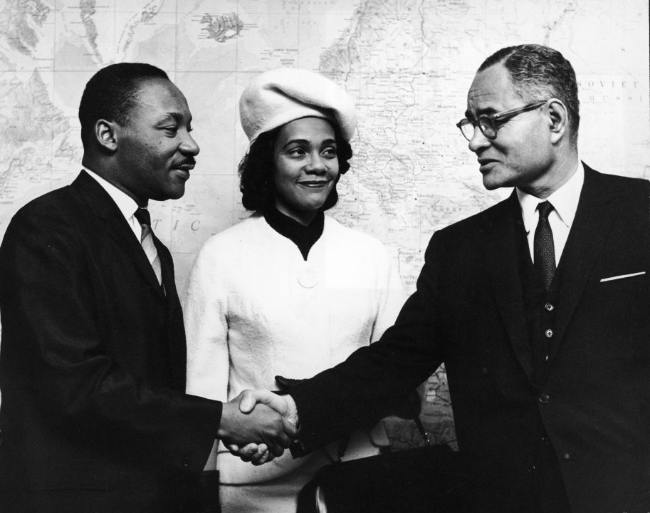 2 (of 4) Ralph Bunche, United Nations Under-Secretary (right), greeting Martin Luther King, Jr. and his wife Coretta. Photo taken in New York, 4 December 1964.