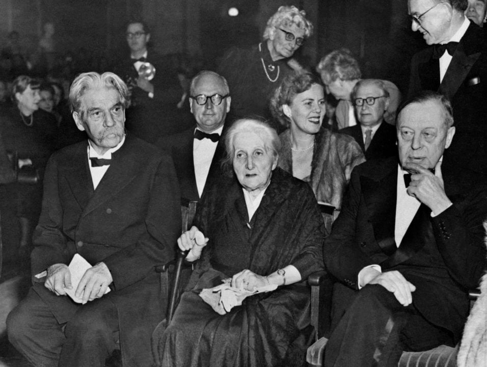 1 (of 2) Albert Schweitzer, his wife Hélène Bresslau and Gunnar Jahn, Chairman of the Nobel Committee at the Nobel Peace Prize award ceremony in the auditorium of Oslo University, 4 November 1954.