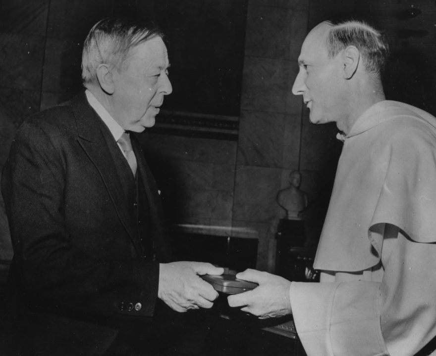 1 (of 1) Dominique Pire receiving his Nobel Prize medal from Gunnar Jahn, Chairman of the Norwegian Nobel Committee at the award ceremony at Oslo University, 10 December 1958.