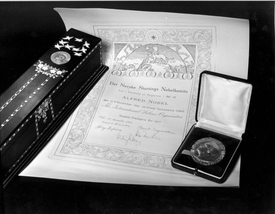 2 (of 3) The 1969 Nobel Prize diploma to ILO, featuring a lithograph by Gerhard Munthe, and the Nobel Peace Prize medal.
