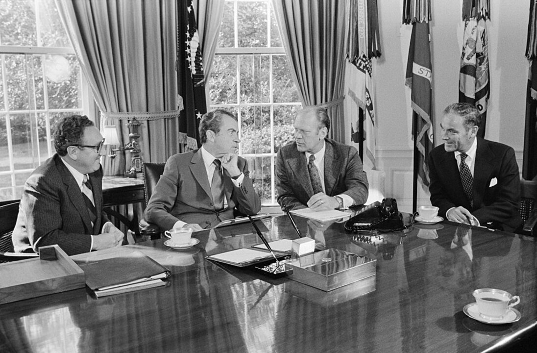 Secretary of State Henry Kissinger in a meeting with President Richard Nixon, Vice President-Designate Congressman Gerald Ford and Chief of Staff Alexander Haig, Jr in the Oval Office of the White House in Washington, DC, 13 October 1973.