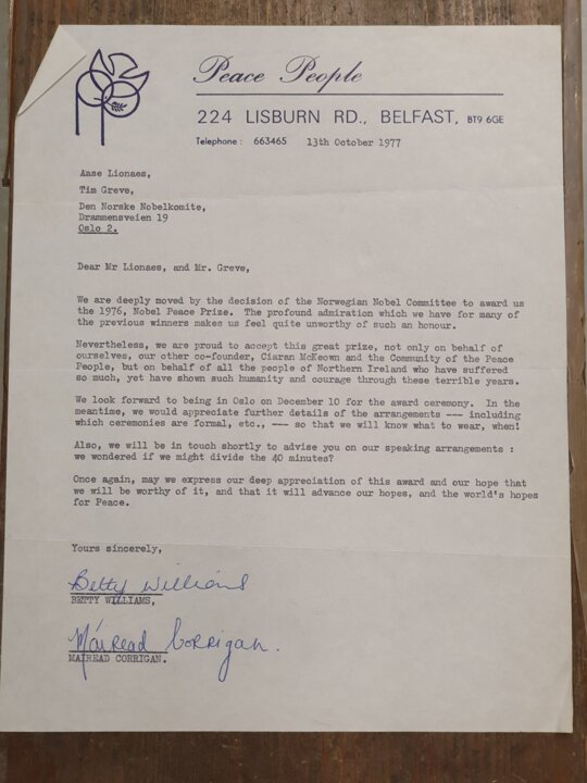 2 (of 8) A letter from Betty Williams and Mairead Corrigan to the Norwegian Nobel Committee after the news that they had been awarded the 1976 Nobel Peace Prize.