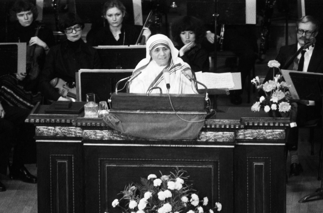 Mother Teresa delivering her acceptance speech on 10 December 1979, in the aula of the University of Oslo, Norway.