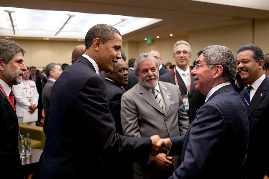 United States President Barack Obama, left, greets Costa Rica President Oscar Arias Sánchez (right) during a reception at the Summit of the Americas in Port of Spain, Trinidad on 17 April 2009.