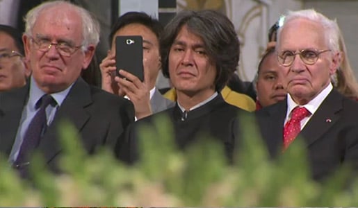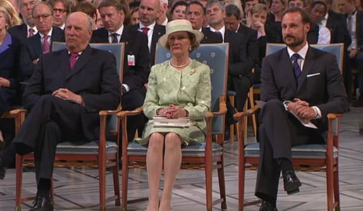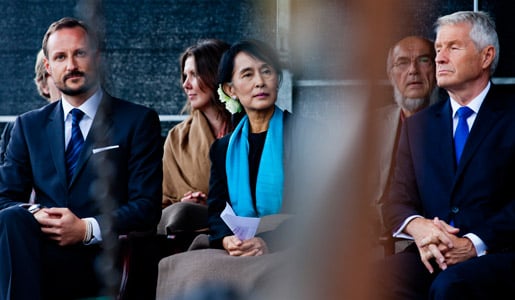 Aung San Suu Kyi in the first row, Crown Prince Haakon (left) and Thorbjørn Jagland, Chairman of the Norwegian Nobel Committee (right), on stage during the celebration in downtown Oslo on 16 June 2012.