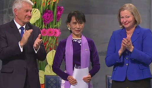 Aung San Suu Kyi and Thorbjørn Jagland, Chairman of the Norwegian Nobel Committee, in the Oslo City Hall, 16 June, 2012.