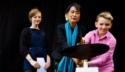 Aung San Suu Kyi lights the flame of peace with Alva (12) and Vetle (12) from Save the Children.