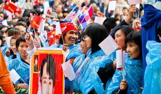 Suu Kyi greeting supporters from Bago State on 14 August 2011, on her first political trip to Bago since her release from house arrest in 2010.
